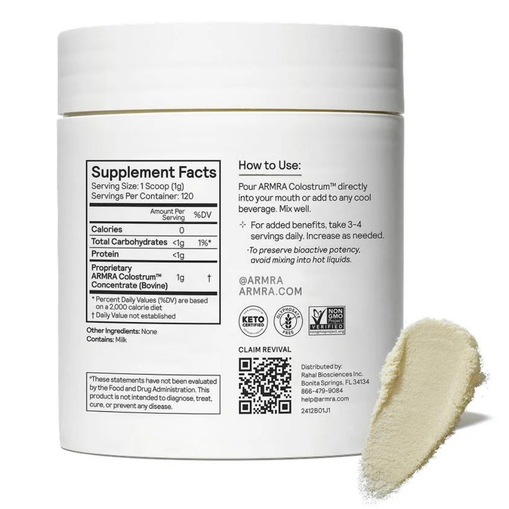 ARMRA Colostrum™ is the premium bovine colostrum concentrate teeming with 400+ bioactive nutrients that strengthen immunity, fuel natural energy, fortify gut health, and more.